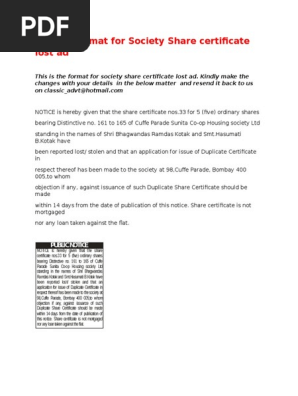 Format For Society Share Certificate Lost Ad Pdf Business